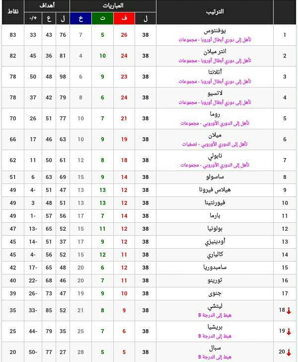 وهبطت فرق ليتشي وبريشيا وسبال لدوري الدرجة الثانية الإيطالي فيما تأهلت فرق يوفنتوس وإنتر ميلان وأتلانتا ولاتسيو لدوري أبطال أوروبا، كما تأهلت فرق روما وميلان ونابولي للدوري الأوروبي في الموسم الجديد.