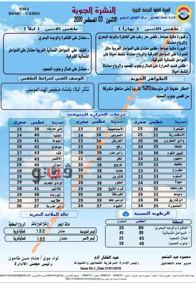 وحذرت الأرصاد من وجود شبورة مائية صباحا وأمطار خفيفة إلى متوسطة على أقصى جنوب الصعيد.