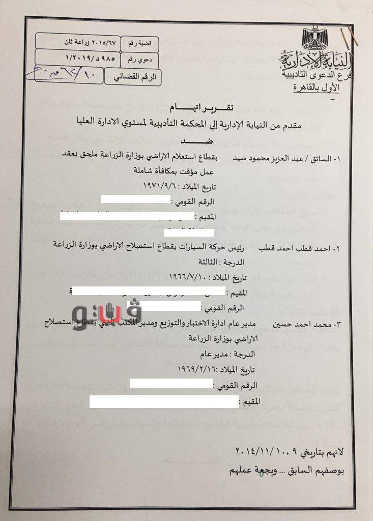 عليا إحالة مدير عام بقطاع استصلاح الأراضي بوزارة الزراعة وآخرين من مساعديه