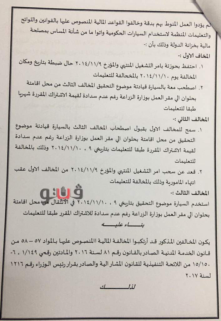 الزراعة إحتفظ بحوزته بأمر التشغيل المنتهي أثناء ضبطه بمكان المخالفة، واصطحب معه