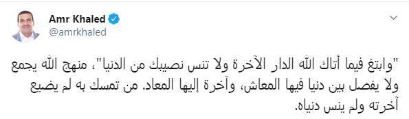 وكتب عمرو خالد تدوينة على الفيس بوك قال فيها: "وابتغ فيما أتاك الله الدار الآخرة ولا تنس نصيبك من الدنيا، منهج الله يجمع ولا يفصل بين دنيا فيها المعاش، وآخرة إليها المعاد. من تمسك به لم يضيع آخرته ولم ينس دنياه".