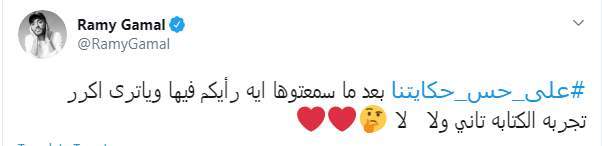 وكتب رامي جمال تغريدة على تويتر قال فيها: "#على_حس_حكايتنا بعد ما سمعتوها ايه رأيكم فيها وياترى اكرر تجربة الكتابة تاني ولا لا".