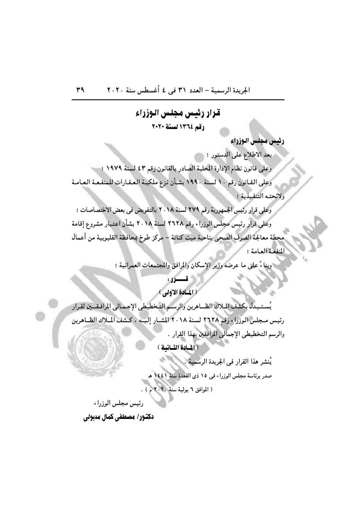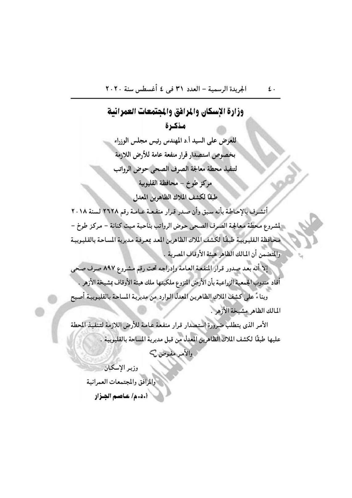 نشرت الجريدة الرسمية في عددها رقم 31، الصادر في 4 أغسطس 2020، قرار رئيس مجلس الوزراء الدكتور مصطفى مدبولي رقم 1364 لسنة 2020، بشأن استصدار قرار منفعة عامة للأرض اللازمة لتنفيذ محطة معالجة الصرف الصحي حوض الرواتب مركز طوخ بمحافظة القليوبية طبقًا لكشف الملاك الظاهرين المعدل.