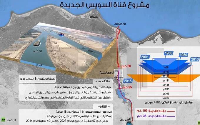 وقناة السويس الجديدة هي عبارة عن فرع بطول ٣٥ كيلومترًا يمر بموازاة قناة السويس الأصلية التي يبلغ طولها ١٩٠ كيلومترًا، ويعود تاريخ بنائها إلى ١٤٥ عامًا، ويهدف إلى مرور السفن في الاتجاهين دون توقف في مناطق انتظار داخل القناة وكذلك تقليل زمن العبور مما يسهم في زيادة الإقبال على استخدام القناة ويرفع من درجة تصنيفها.