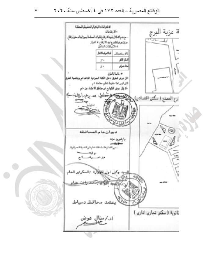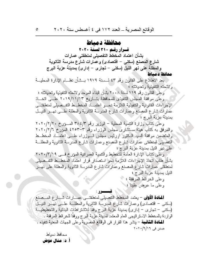 نشرت جريدة الوقائع المصرية في عددها رقم 172، الصادر في 4 أغسطس 2020، قرار محافظة دمياط رقم 310 لسنة 2020، بشأن اعتماد المخطط التفصيلي لمنطقتي عمارات شارع المصنع (سكني- اقتصادي) وعمارات شارع مدرسة الثانوية والمطلة على نهر النيل (سكني- تجاري- إداري) بمدينة عزبة البرج.