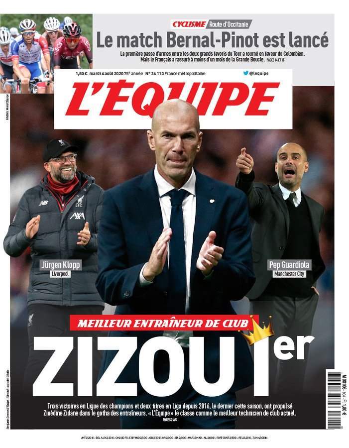 وأشارت صحيفة موندو ديبورتيفو أن ليكيب الفرنسية وضعت زيدان أفضل مدرب في عالم الأندية، وهو ما ينعكس في غلاف الصحيفة الذي يظهر فيه مدرب ريال مدريد أمام كلوب وكوارديولا ، اللذين يرافقانه على المنصة.