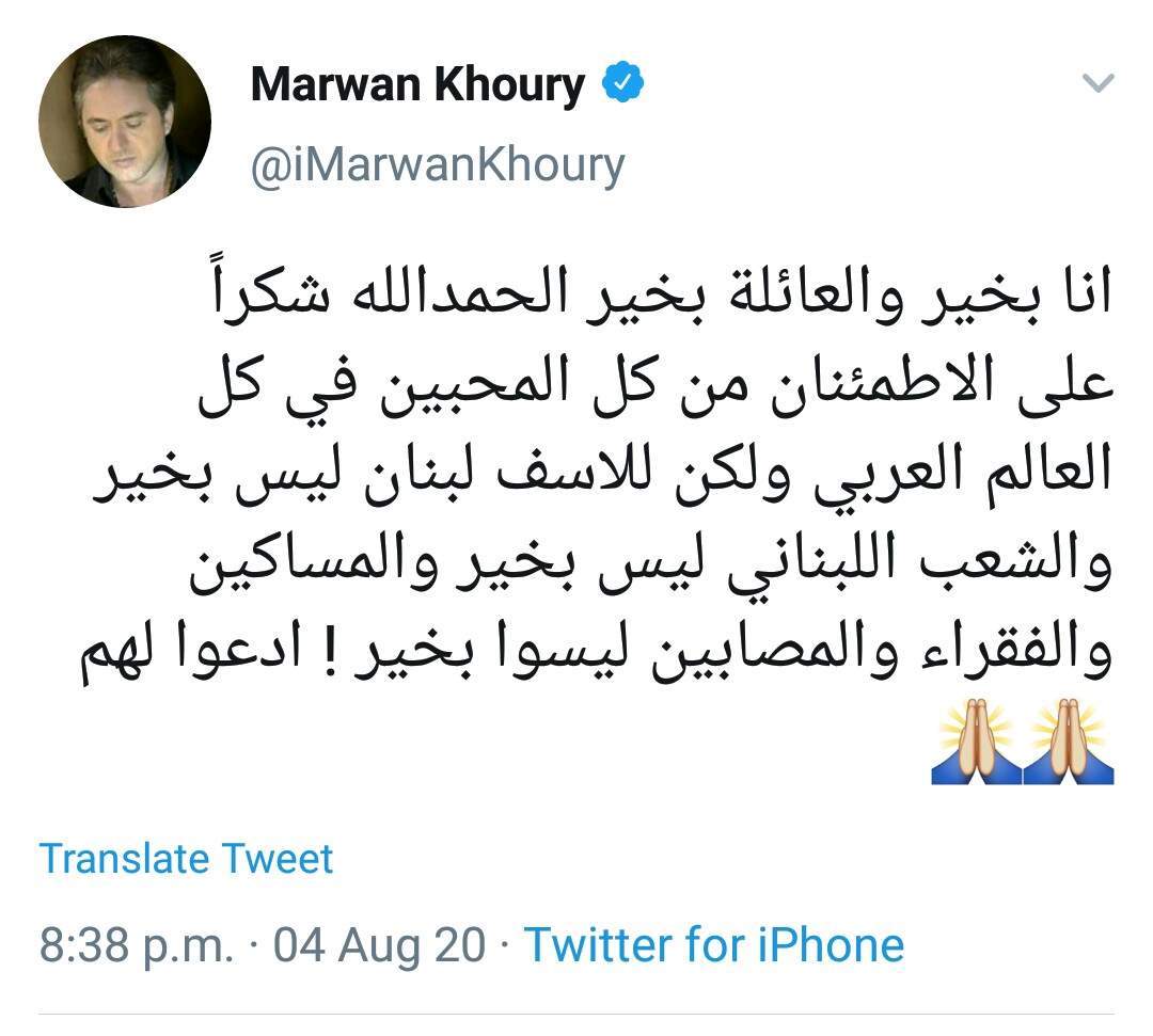 وكتب مروان خوري مطمئنا جمهوره ومحبيه: "نا بخير والعائلة بخير الحمد الله شكراً على الاطمئنان من كل المحبين في كل العالم العربي".