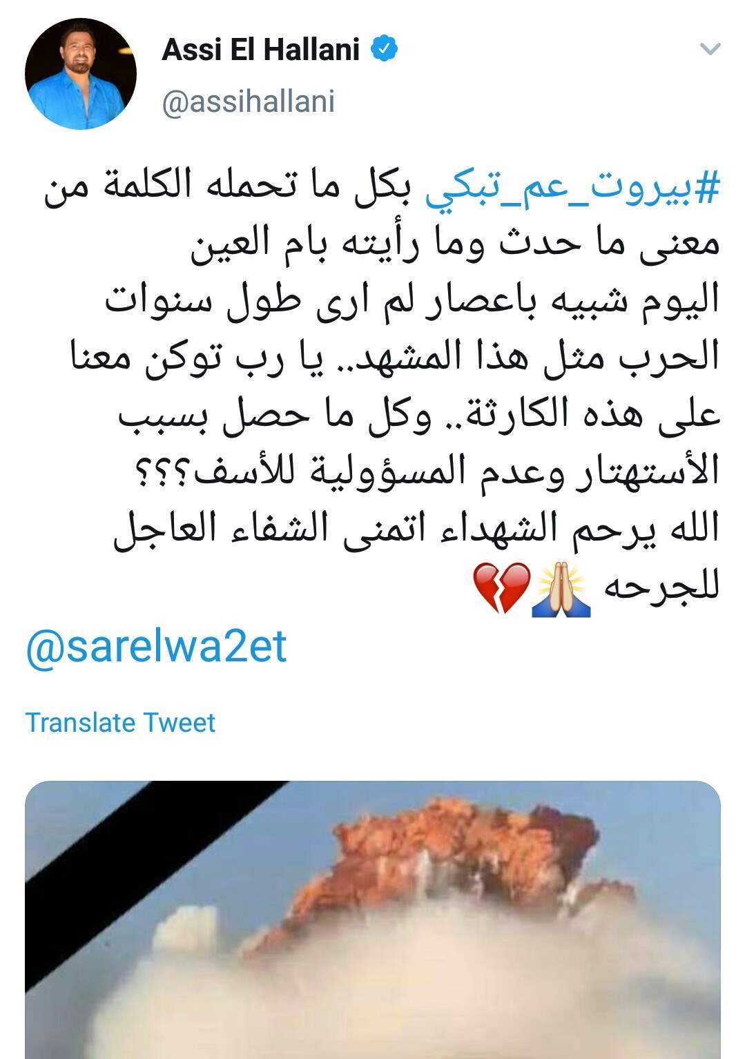 وكتب عاصي الحلاني قائلا: "#بيروت_عم_تبكي بكل ما تحمله الكلمة من معنى ما حدث وما رأيته بأم العين اليوم شبيه باعصار لم أر طوال سنوات الحرب مثل هذا المشهد.. يا رب تكون معنا على هذه الكارثة".