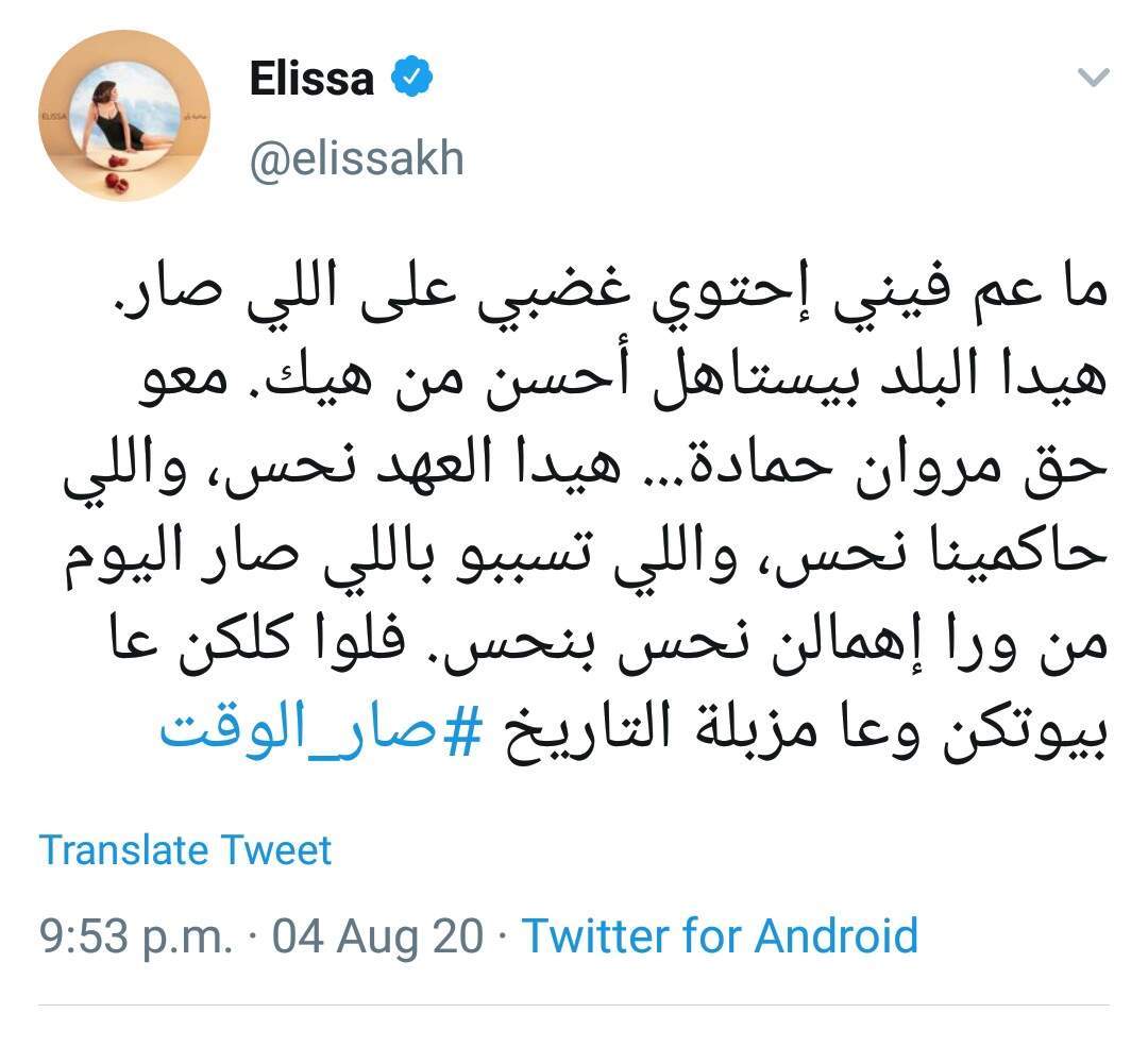 وكتبت إليسا قائلة: "ما عم فيني إحتوي غضبي على اللي صار. هيدا البلد بيستاهل أحسن من هيك. معو حق مروان حمادة... هيدا العهد نحس، واللي حاكمينا نحس، واللي تسببو باللي صار اليوم من ورا إهمالن نحس بنحس. فلوا كلكن عا بيوتكن وعا مزبلة التاريخ #صار_الوقت".