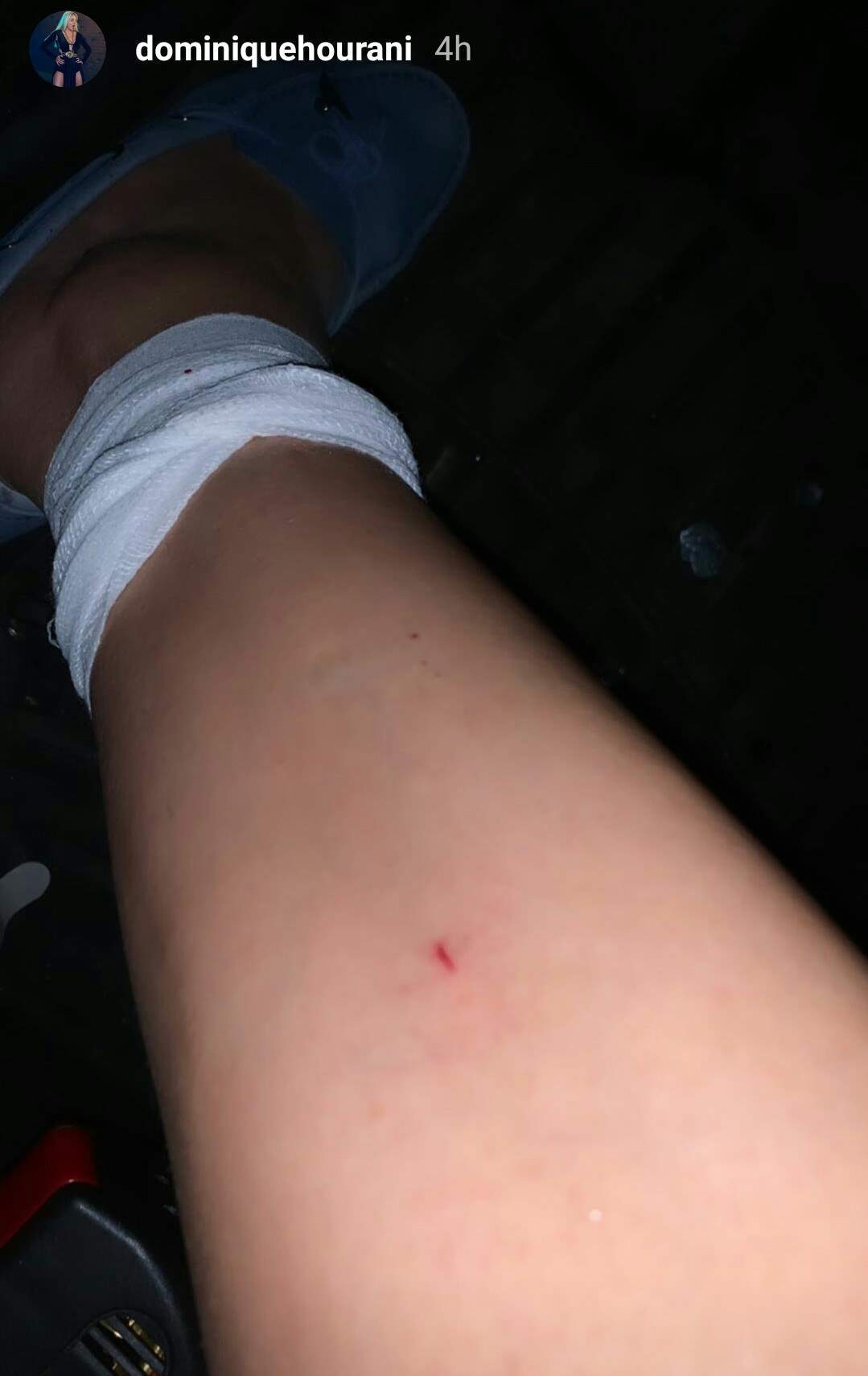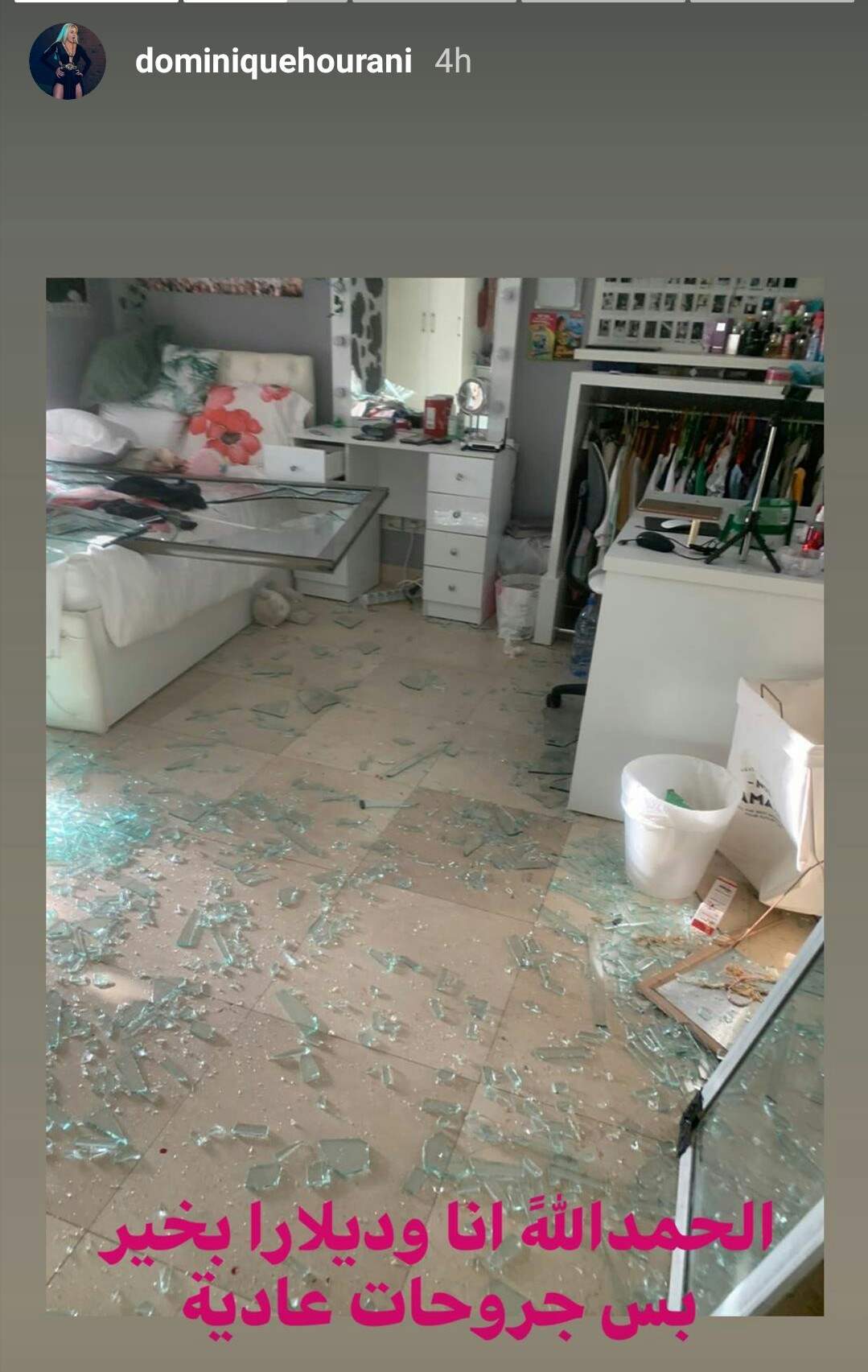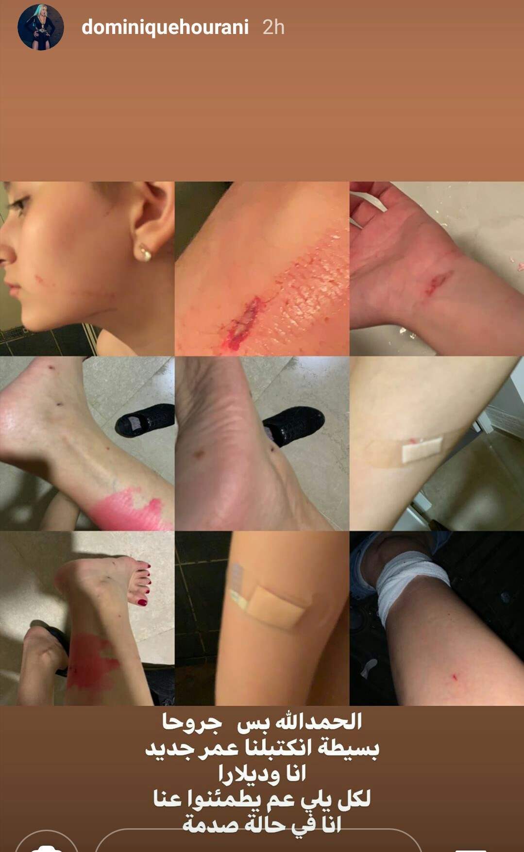 ونشرت دومينيك حوراني عبر خاصية الاستوري على حسابها على موقع الصور الشهير "انستجرام"، صورا توضح حجم إصابتها معلقة عليها: "الحمد لله بس جروحا بسيطة، انكتبلنا عمر جديد أنا وديلارا، لكل ياللي عم يطمنوا عنا أنا في حالة صدمة".