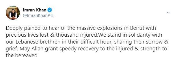 وكتب عمران خان تغريدة على تويتر "تألمت بعمق لسماع الانفجارات الهائلة التي وقعت في بيروت وفقدت فيها أرواح وثلاثة آلاف جريح، نحن نتضامن مع إخواننا اللبنانيين في هذه الساعات الصعبة، ونشاركهم حزنهم ومأساتهم. أسأل الله أن يشفي الرحى ويقوي أهل من فُقدوا"