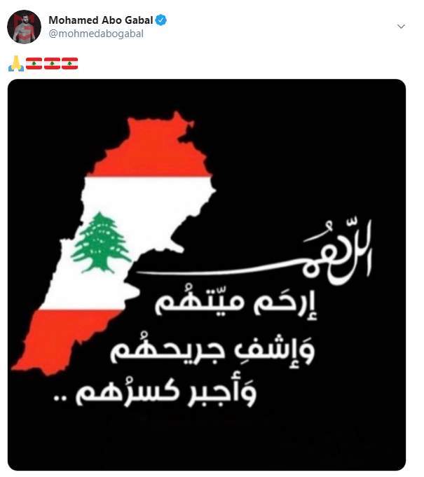 وكتب محمد أبو جبل تغريدة على تويتر تضامنًا من الشعب اللبناني قائلاً: "اللهم ارحم ميتهم.. واشف جريحهم، واجبر كسرهم"