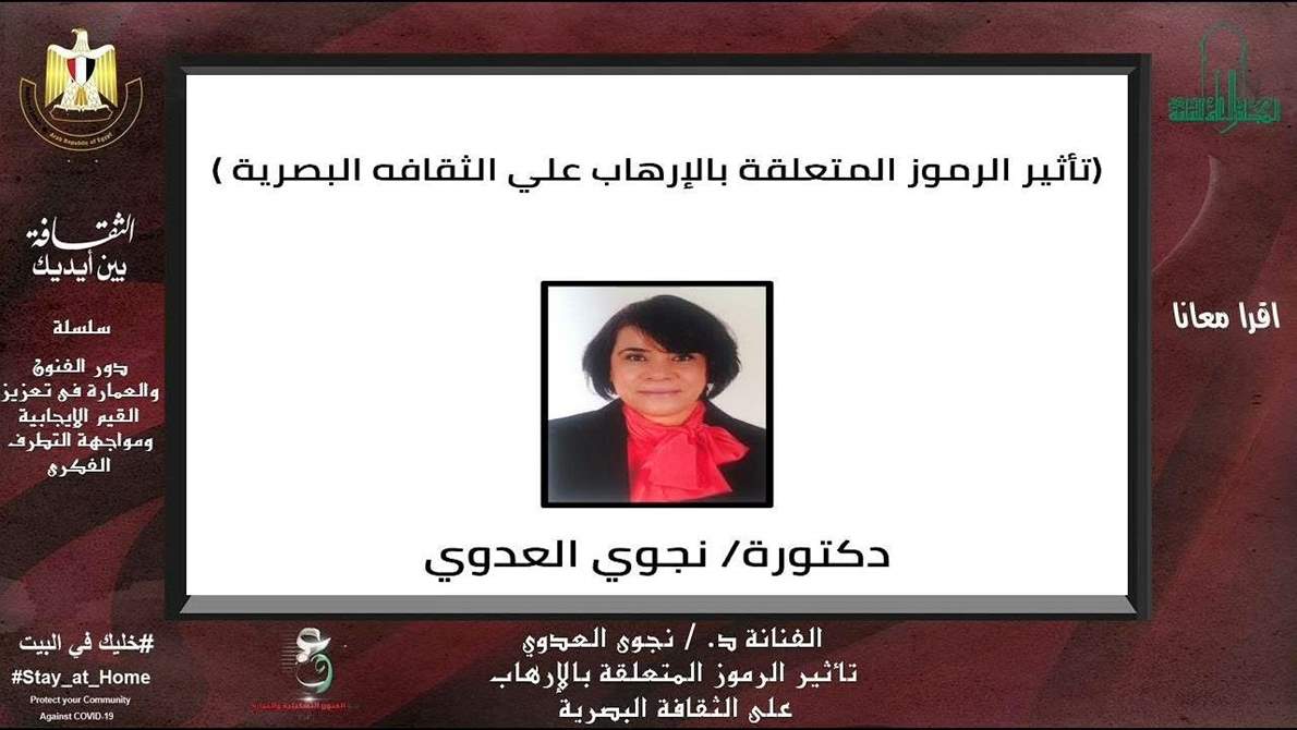 يستضيف المجلس الأعلى للثقافة، الدكتورة نجوى العدوي عضو نقابة الفنانين التشكيليين وأستاذ تصميم المطبوعات بكلية الفنون التطبيقية, فى تمام السابعة من مساء يوم الخميس 20 أغسطس الجاري، لتلقى محاضرة بعنوان "تأثير الرموز المتعلقــة بالإرهــاب على الثقافـــة البصريـــة", وذلك عبر قناة أمانة المؤتمرات بالمجلس على موقع الفيديوهات الشهير " يوتيوب ".