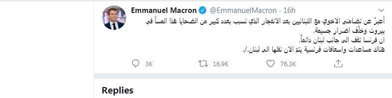 وأعرب ماكرون فى تغريدة له على صفحته الرسمية فى موقع التواصل الاجتماعى "تويتر" عنه وقوفة بحانب لبنان وتضامنه معها قائلا : "أعبر عن تضامنى الأخوى مع اللبنانيين بعد الانفجار الذى تسبب بعدد كبير من الضحايا هذا المساء فى بيروت وخلف أضرارا جسيمة".