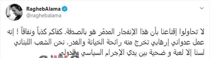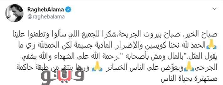 كتب راغب عبر حسابه على تويتر: "صباح الخير. صباح بيروت الجريحة. شكرا للجميع اللي سألوا وتطمنوا علينا.. الحمد لله نحنا كويسين والأضرار المادية جسيمة لكن الحمد لله زي ما يقول المثل (بالمال ومش بأصحابه) رحمة الله على الشهداء والله يشفي الجرحى ويعوّض على الناس الخسائر، وربنا ينتقم من طبقة حاكمة مستهترة بحياة الناس".