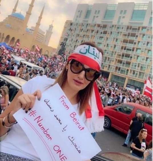 التي تلتف بعلم لبنان، وتمسك بلافتة مكتوب عليها: "منحبك يا محمد رمضان.. نمبر