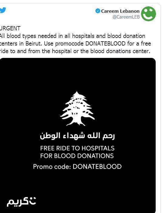 ونشر التطبيق على صفحته الخاصة على منصة التواصل الاجتماعي "تويتر"، تغريدة جاء فيها: "كل المستشفيات ومراكز التبرع بالدم تحتاج جميع فئات الدم في بيروت. استخدم الرمز الترويجي DONATEBLOOD للحصول على رحلة مجانية من وإلى المشافي أو مراكز التبرع بالدم".