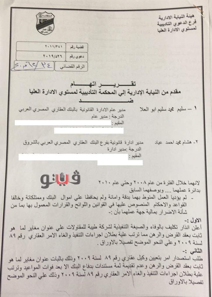 القضية رقم 34 لسنة 62 قضائية عليا إحالة مسئولين من القيادات القانونية بالبنك العقاري المصري العربي للمحاكمة