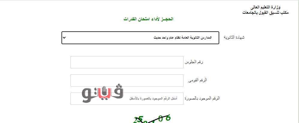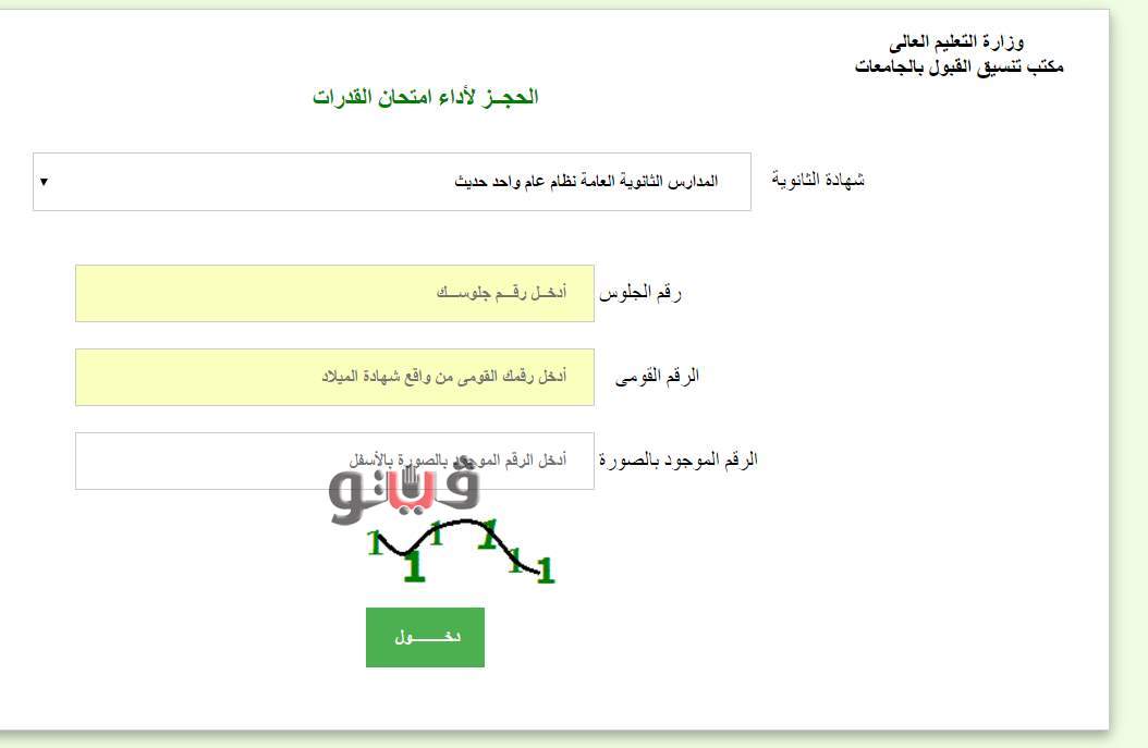 3- بعد دخول الطالب على صفحة تسجيل اختبارات القدرات على الموقع، يقوم الطالب ببدء عملية التسجيل لأداء اختبارات القدرات وذلك باستخدام الرقم القومى ورقم الجلوس الخاص بالطالب.
