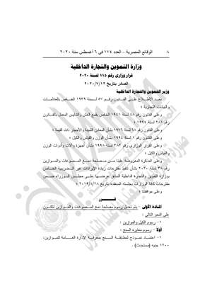 نشرت جريدة "الوقائع المصرية" في عددها رقم 174، الصادر في 6 أغسطس 2020، قرار وزارة التموين والتجارة الداخلية رقم 115 لسنة 2020، تعديل رسوم مصلحة دمغ المصوغات والموازين.