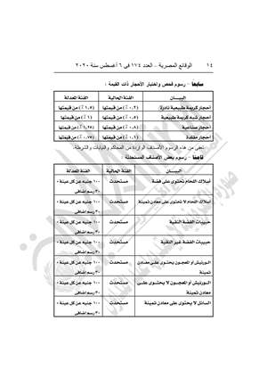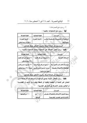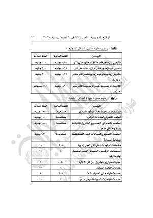 أولاً رسوم معايرة السنج 1200 جنيه (مستحدث)، ورسوم معايرة أجهزة الوزن 2500 جنيه مستحدث، ورسوم دمغ المشغولات الذهبية والفضية المركب عليها ذهب من 40 قرشًا للجرام إلى 100 قرش للجرام و50 قرشًا رسم إضافي.