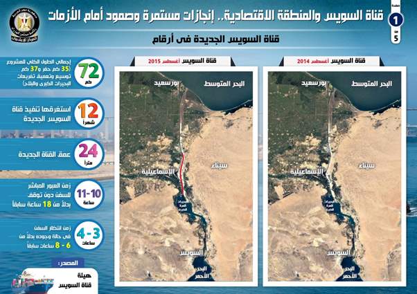 وتجدر الإشارة إلى أن تنفيذ قناة السويس الجديدة استغرق 12 شهراً، حيث بلغ إجمالي الطول الكلي للمشروع 72 كم، مقسمة إلى 35 كم حفر، و37 كم توسيع وتعميق تفريعات البحيرات الكبرى والبلاح، وبعمق 24 متراً.