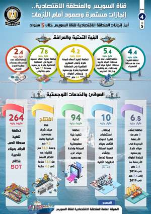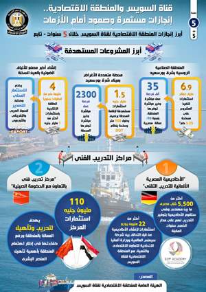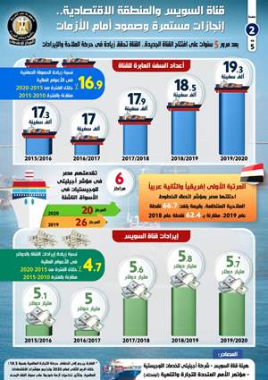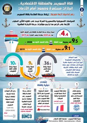 وفي هذا السياق، أصدر المركز الإعلامي لمجلس الوزراء تقريراً تضمن إنفوجرافاً سلط الضوء على مدى صمود قناة السويس أمام الأزمات، وتحسن حركة الملاحة بها خلال الفترة الأخيرة، بالإضافة إلى الإنجازات التي تحققت على مدار السنوات الخمس الماضية في المنطقة الاقتصادية.