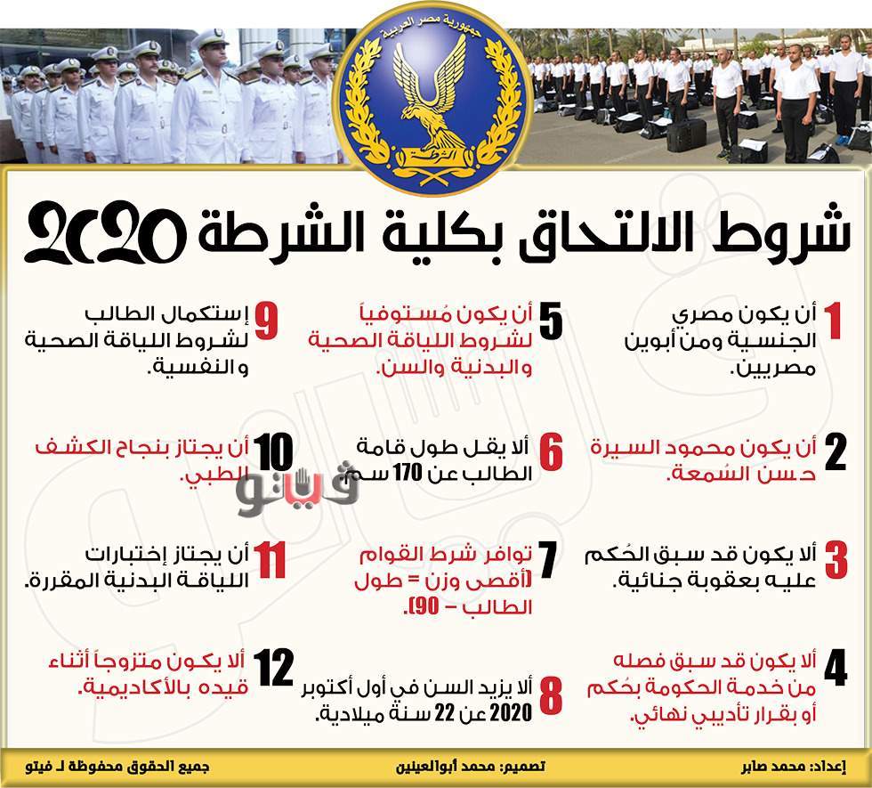 شروط الالتحاق بكلية الشرطة 2020 | إنفو جراف السبت 08/أغسطس/2020 - 04:42 م 8/8/2020 4:42:15 PM شروط الالتحاق بكلية الشرطة 2020| محمد صابر شارك طباعة 18 حجم الخط شارك طباعة وزارة الداخلية كلية الشرطة قسم الضباط المتخصصين التقديم لكلية الشرطة