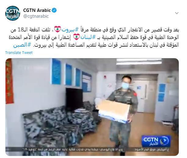بعد وقت قصير من الانفجار الذي وقع في منطقة مرفأ #بيروت، تلقت الدفعة الـ18 من الوحدة الطبية في قوة حفظ السلام الصينية بـ #لبنان إشعارا من قيادة قوة الأمم المتحدة المؤقتة في لبنان بالاستعداد لنشر قوات طبية لتقديم المساعدة الطبية إلى بيروت. #الصين pic.twitter.com/LfJL2XlW8X— CGTN Arabic (@cgtnarabic) August 6, 2020