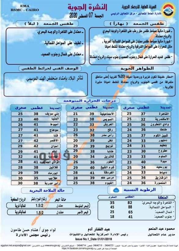 وفيما يلى بيان بدرجات الحرارة المتوقعة اليوم على مدن ومحافظات مصر..