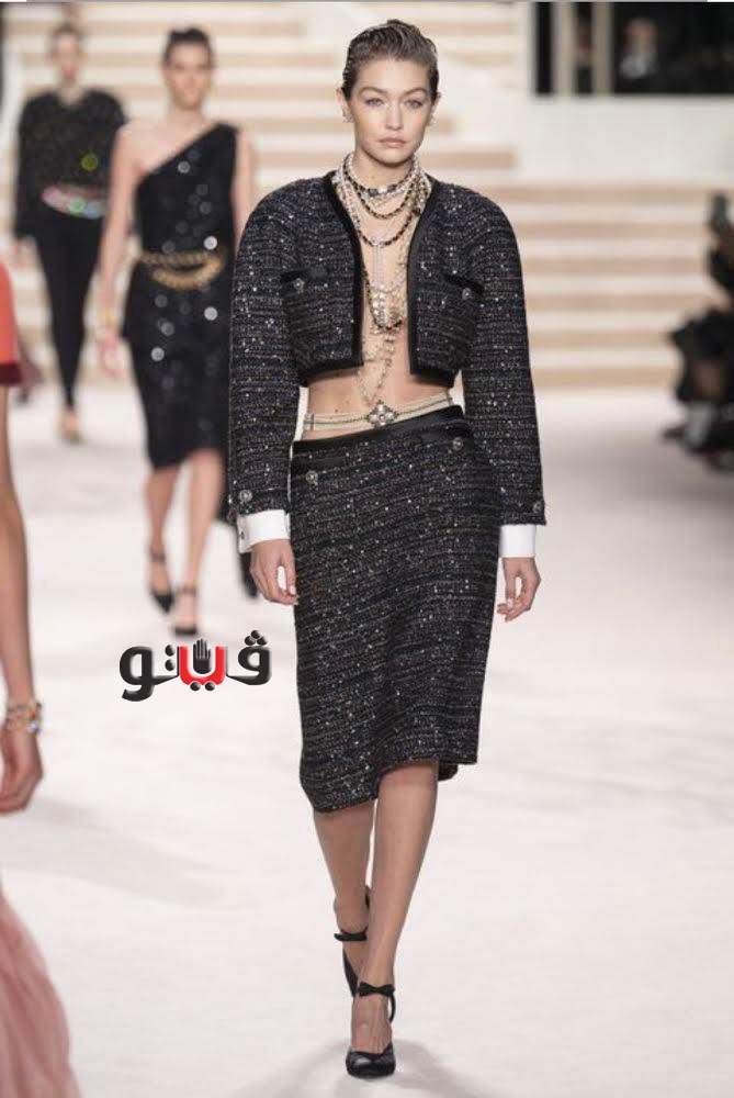 وصممت فساتين طويلة ومتوسطة الطول بألوان الأبيض بمزيج من الأسود، وبدلة بستايل الـCrop Top تألقت بها الموديل جيجي حديد باللون الأسود اللامع بالفصوص الفضية.