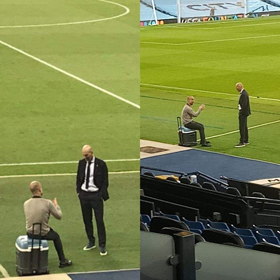وبعد انتهاء المباراة تصافح بيب جوارديولا وزين الدين زيدان، وانتشرت صورة للمدربين بداخل ملعب الاتحاد وهما يتحدثان معا، بينما ينتظرهما جميع لاعبي الفريقين بداخل غرف الملابس.