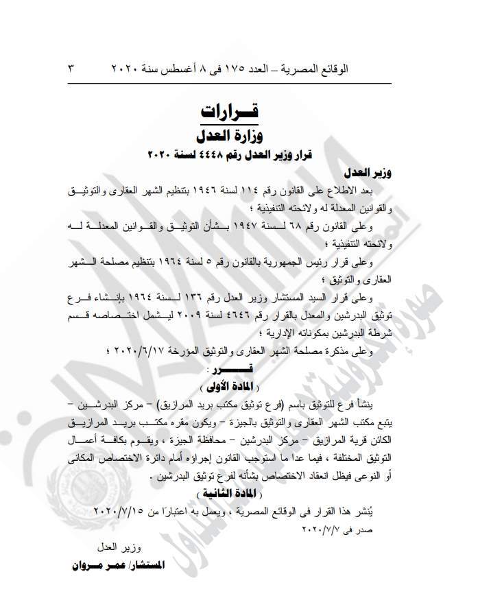 القرار رقم 4448 لسنة 2020، بشأن إنشاء فرع للتوثيق باسم (فرع توثيق مكتب بريد المرازيق) مركز البدرشين يتبع مكتب الشهر العقاري والتوثيق بالجيزة، ويكون مقره مكتب بريد المرازيق الكائن بقرية المرازيق مركز البدرشين محافظة الجيزة، ويقوم بكافة أعمال التوثيق المختلفة، فيما عدا ما استوجب القانون إجراؤه أمام دائرة الاختصاص المكاني أو النوعي فيظل انعقاد الاختصاص بشأنه لفرع توثيق البدرشين.