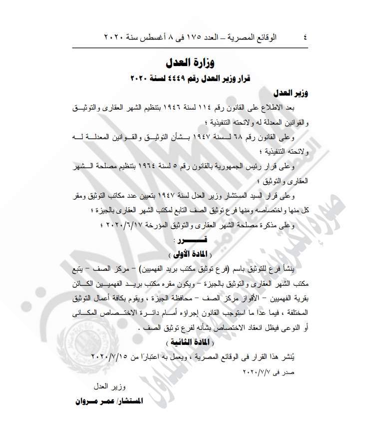 والقرار رقم 4449 لسنة 2020، بشأن إنشاء فرع للتوثيق باسم (فرع توثيق بريد الفهميين) مركز الصف يتبع مكتب الشهر العقاري والتوثيق بالجيزة، ويكون مقره مكتب بريد الفهميين الكائن بقرية الفهميين الأقواز مركز الصف محافظة الجيزة، ويقوم بكافة أعمال التوثيق المختلفة، فيما عدا ما استوجب القانون إجراؤه أمام دائرة الاختصاص المكاني أو النوعي فيظل انعقاد الاختصاص بشأنه لفرع توثيق الصف.