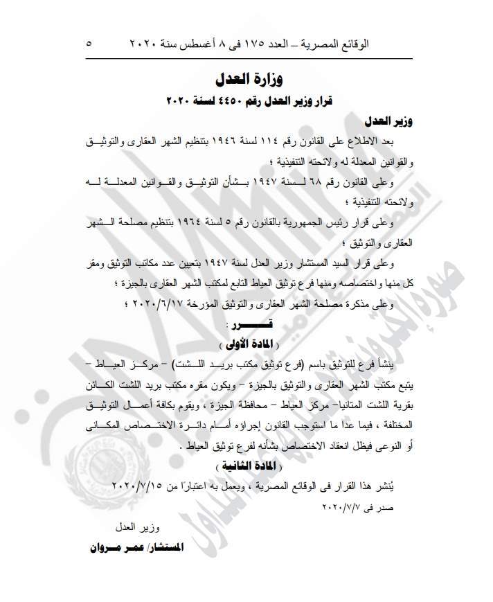 والقرار رقم 4450 لسنة 2020، بشأن إنشاء فرع للتوثيق باسم (فرع توثيق مكتب بريد اللشت) مركز العياط يتبع مكتب الشهر العقارى والتوثيق ويكون مقره مكتب بريد اللشت الكائن بقرية اللشت المتانيا مركز العياط محافظة الجيزة، ويقوم بكافة أعمال التوثيق المختلفة، فيما عدا ما استوجب القانون إجراؤه أمام دائرة الاختصاص المكاني أو النوعي فيظل الاختصاص بشأنه لفرع توثيق العياط.