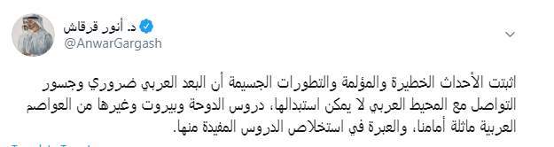 قال الدكتور أنور قرقاش، وزير الشؤون الخارجية لدولة الإمارات العربية، إن الأحداث الخطيرة والتطورات الجسيمة التي تحدث أثبتت أن البُعد العربي ضروري وجسور التواصل مع المحيط العربي لا يمكن استبدالها.