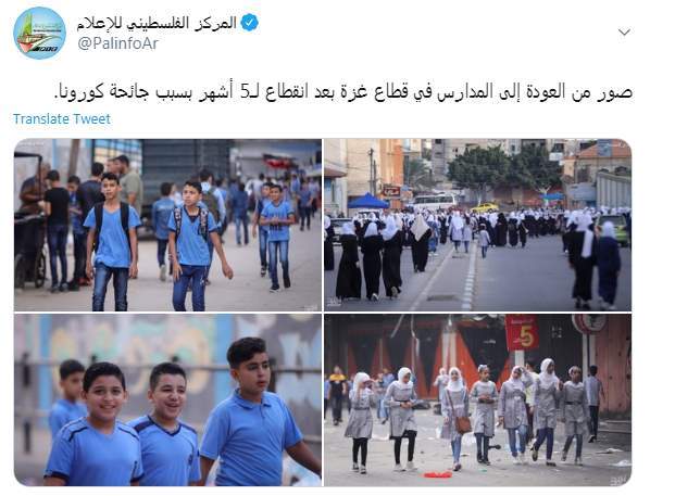 وأكد المركز الفلسطيني للإعلام أن العام الدراسي في قطاع غزة بدأ اليوم بعد توقف دام حوالي 5 أشهر بسبب جائحة كورونا؛ حيث التحق، صباح اليوم السبت، طلبة في قطاع غزة بمدارسهم لبدء العام الدراسي الجديد 2020/2021.