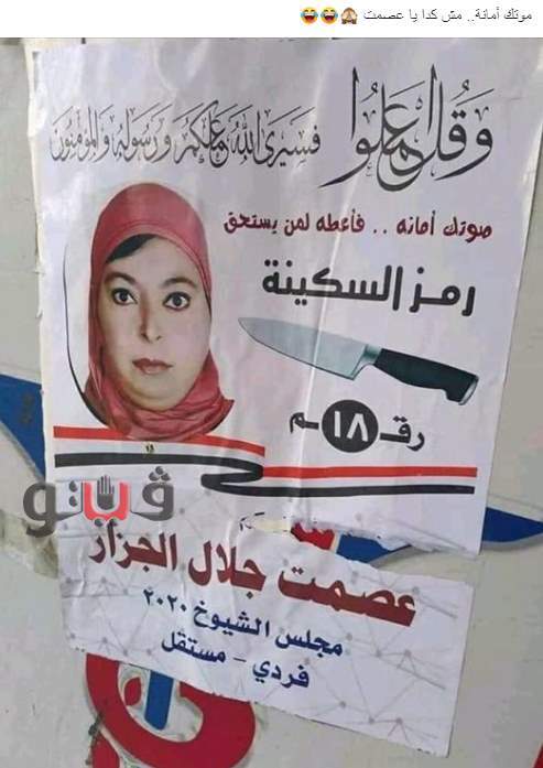 المواقع التواصل الاجتماعي، المرشح على الفردي مستقل عصمت جلال الجزار، واستعانته بشعار صوتك أمانة اعطيه لمن يستحق، وظهرت كلمة "صوتك" كأنها "موتك"