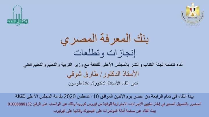 يعقد المجلس الأعلي للثقافة , في الرابعة من عصر الإثنين المقبل الموافق 10 أغسطس الجاري , ندوة بعنوان " بنك المعرفة المصري .. إنجازات وتطلعات"، تنظمها لجنة الكتاب والنشر٬ بحضور الدكتور طارق شوقي وزير التربية والتعليم والتعليم الفني.