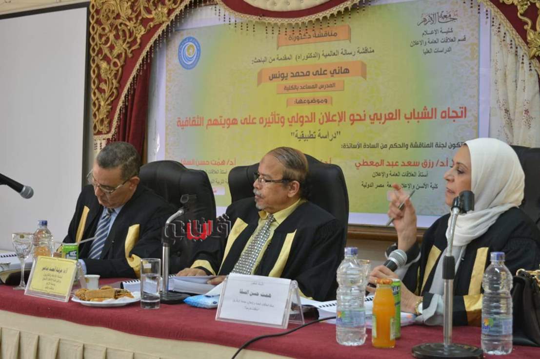 نوقشت بكلية الإعلام جامعة الأزهر رسالة العالمية الدكتوراه المقدمة من الباحث هاني يونس المدرس المساعد بقسم العلاقات العامة والإعلان. بعنوان: اتجـاه الشباب العربي نحو الإعــلان الدولي وتأثيره على هُويَّتهم الثقافية (دراسة تطبيقية)، وحصل الباحث على درجة العالمية الدكتوراه بمرتبة الشرف الأولى مع التوصية بالطبع والتبادل بين الجامعات.