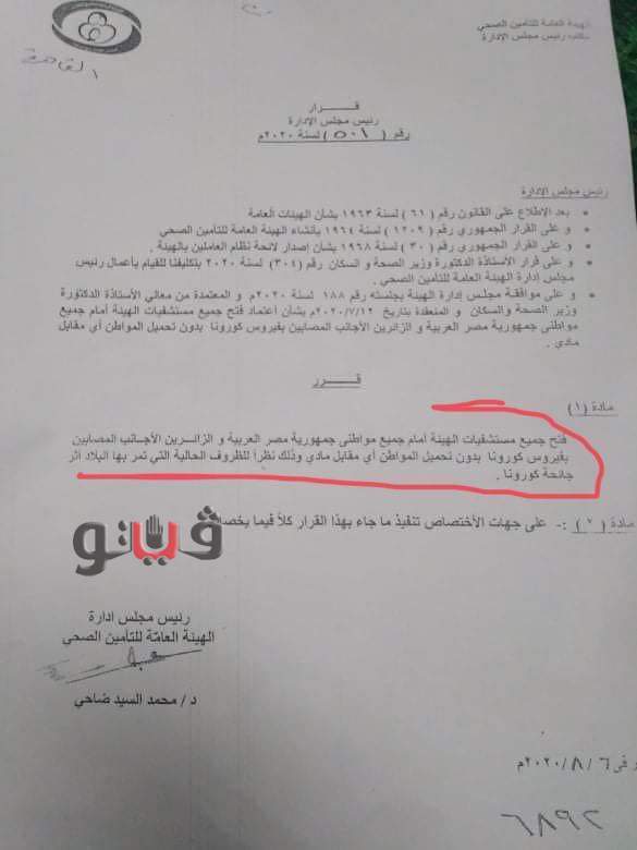 أصدر الدكتور محمد ضاحي رئيس هيئة التأمين الصحى قرارا رقم ٥٠١ لسنة ٢٠٢٠ بشأن فتح جميع مستشفيات الهيئة أمام جميع المصريين والأجانب المصابين بفيروس كورونا بدون تحمل أي تكاليف مالية إثر الظروف التي تمر بها البلاد نتيجة جائحة فيروس كورونا.