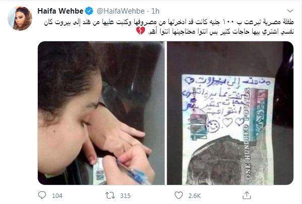 ونشرت هيفاء وهبي صورة للطفلة وهي توقع رسالة على المائة جنيه لأهل لبنان، معلقة عليها قائلة: "طفلة مصرية