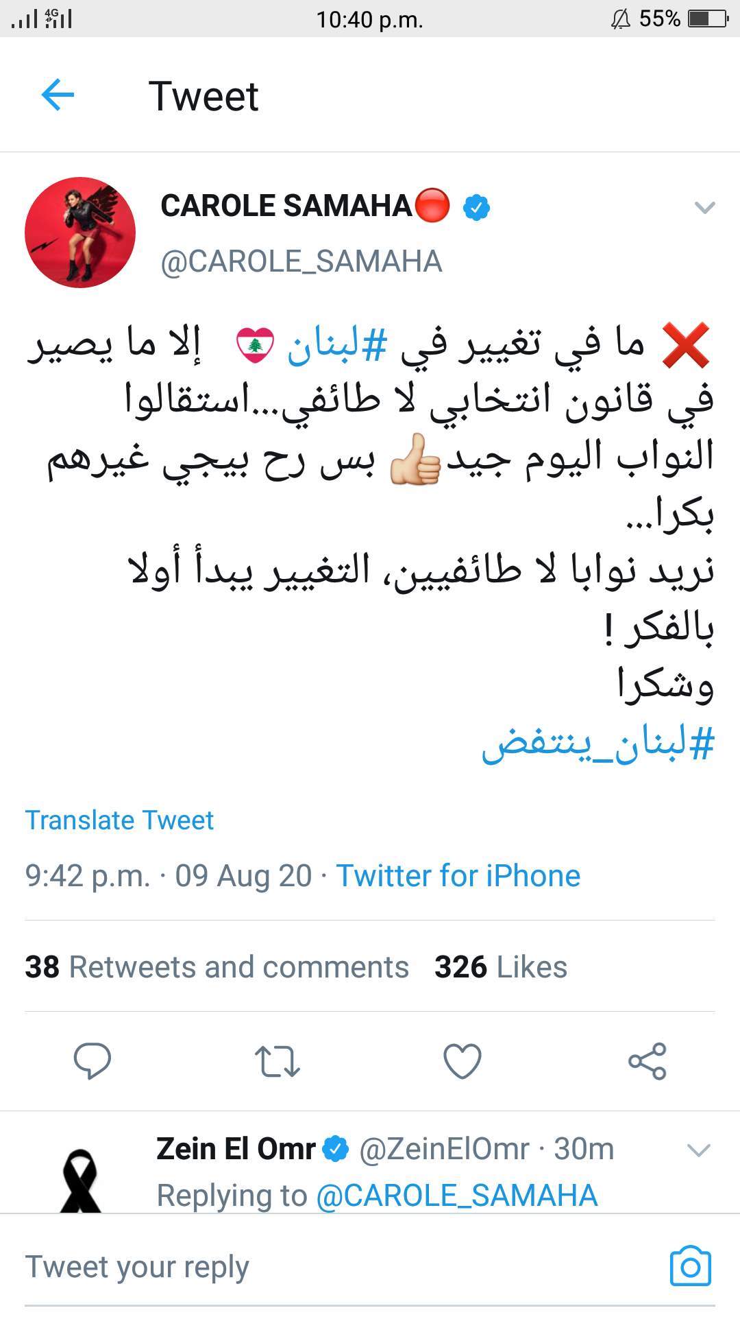 وكتبت كارول سماحة قائلة: "ما في تغيير في #لبنان إلا ما يصير في قانون انتخابي لا طائفي.. استقالوا النواب اليوم جيد بس راح بيجي غيرهم بكرا… نريد نوابا لا طائفيين، التغيير يبدأ أولا بالفكر ! وشكرا #لبنان_ينتفض".