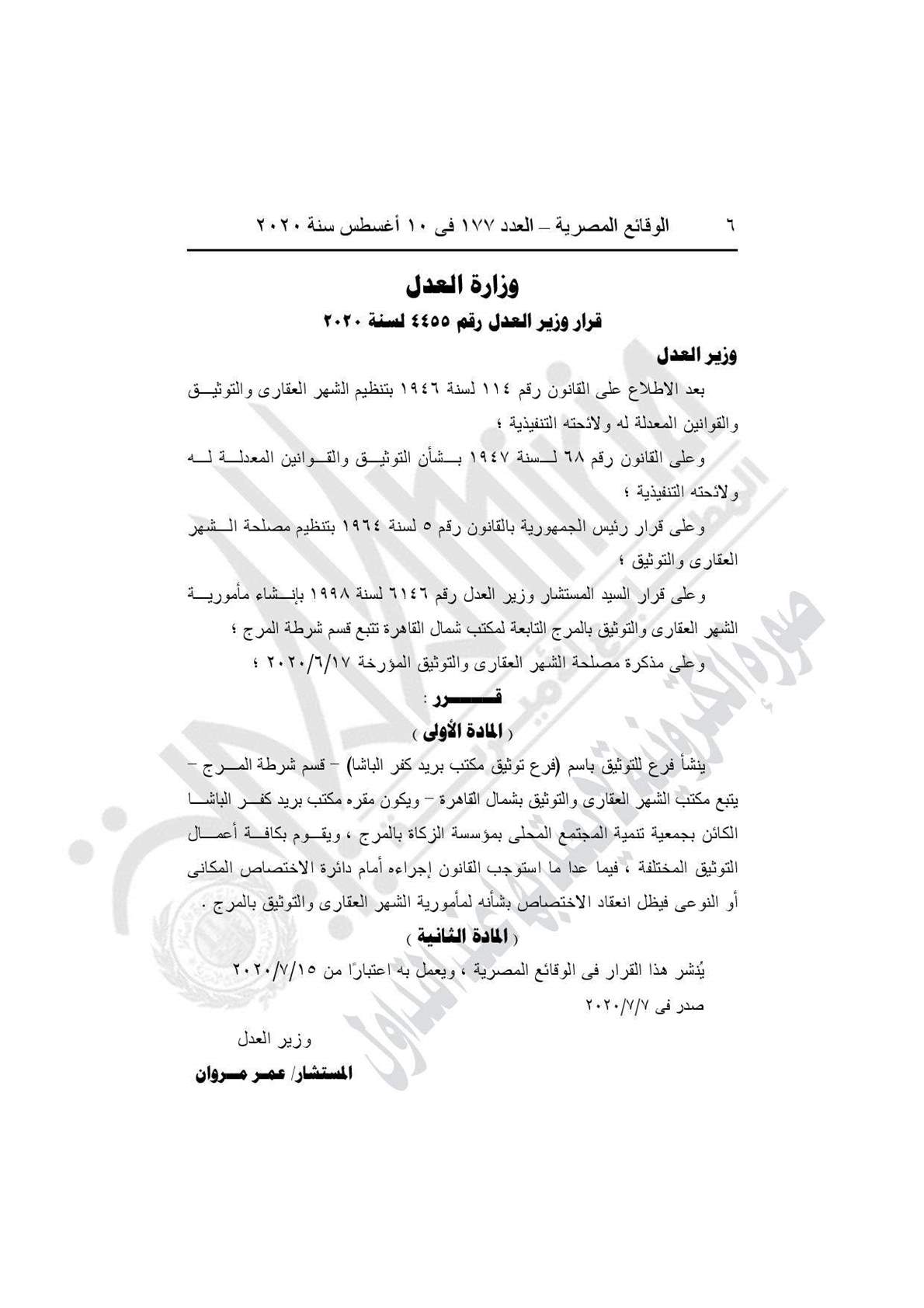 - القرار رقم 4455 لسنة 2020، بإنشاء فرع للتوثيق باسم (فرع توثيق بريد كفر