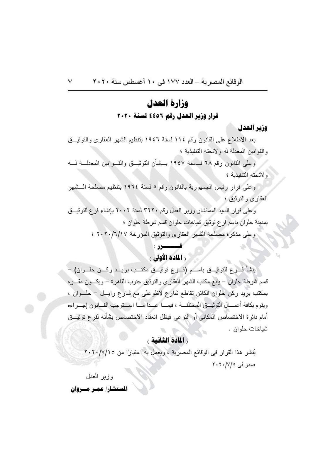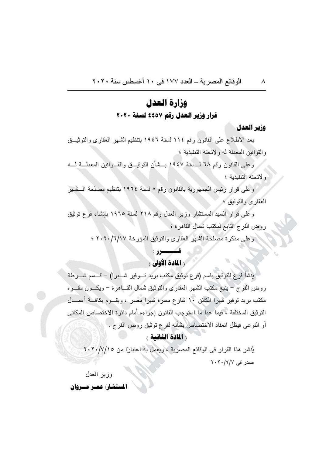 - القرار رقم 4457 لسنة 2020، بإنشاء فرع للتوثيق العقاري باسم (فرع توثيق