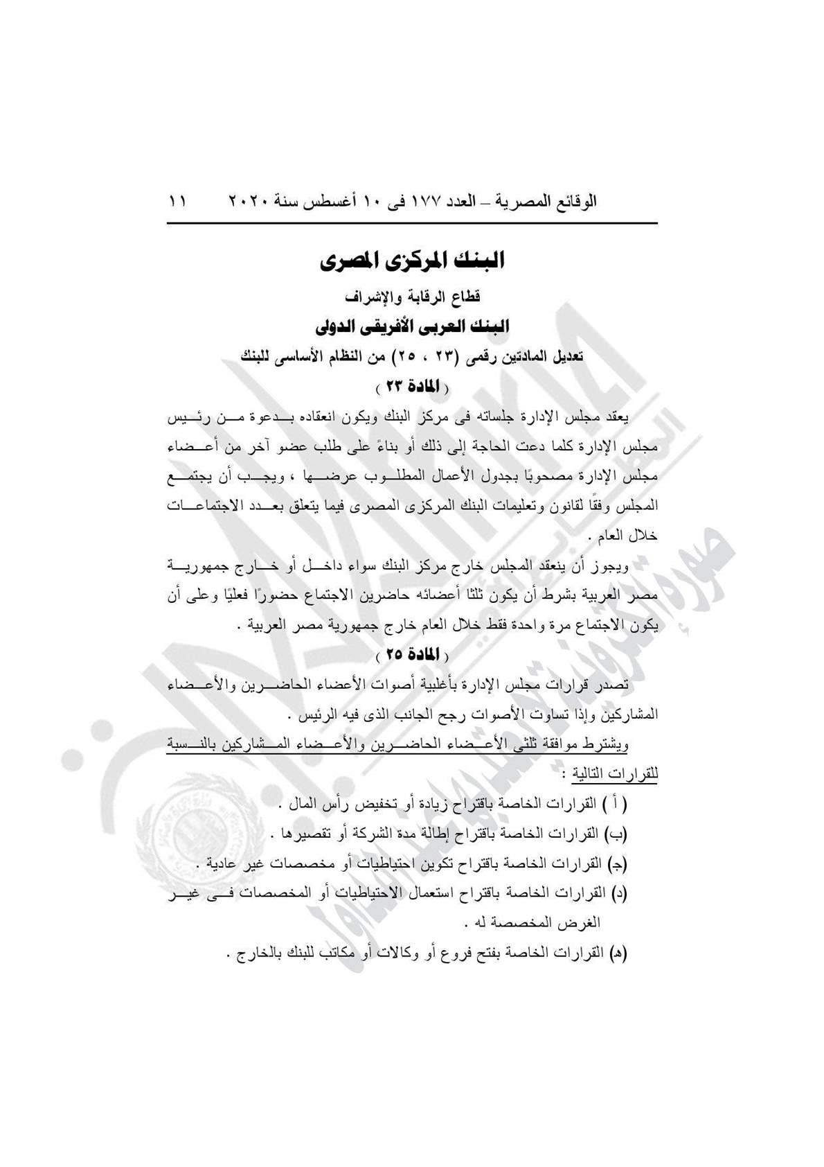 نشرت جريدة الوقائع المصرية في عددها رقم 177، الصادر في 10 أغسطس 2020، قرار البنك المركزي المصري قطاع الرقابة والإشراف بخصوص تعديل مادتين (23، 25) من النظام الأساسي للبنك العربي الإفريقي الدولي.