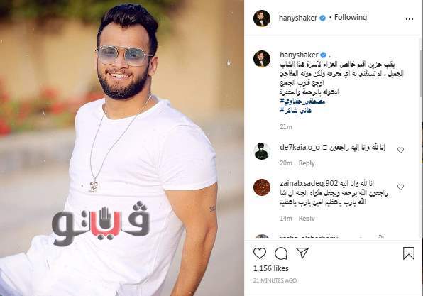 وكتب هاني شاكر: «بقلب حزين أقدم خالص العزاء لأسرة هذا الشاب الجميل، لم تسبقني به أي معرفه ولكن موته المفاجئ أوجع قلوب الجميع.. ادعوله بالرحمة والمغفرة».