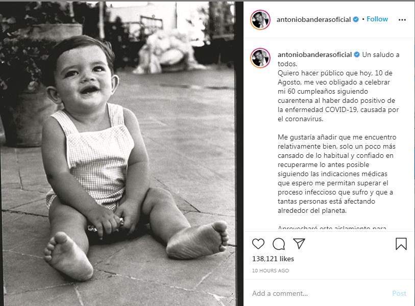 وكتب "بانديراس" باللغة الإسبانية معلقًا على صورة له في طفولته: "أريد أن أعلنها للعامة، اليوم أحتفل بعيد ميلادي الـ60 في الحجر المنزلي بعد إصابتي بعدوى فيروس كورونا".