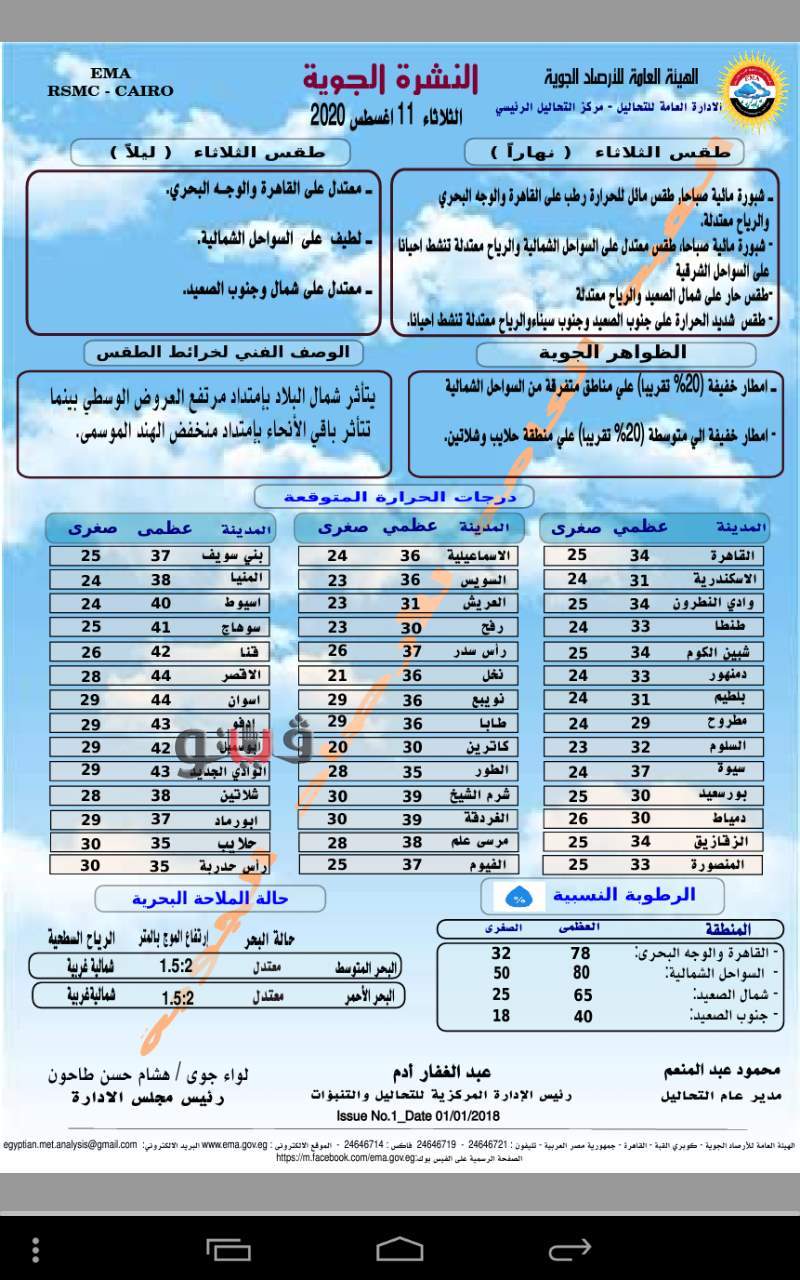وحذرت الأرصاد من وجود شبورة مائية صباحية وأمطار خفيفة على السواحل الشمالية وعلى حلايب وشلاتين.