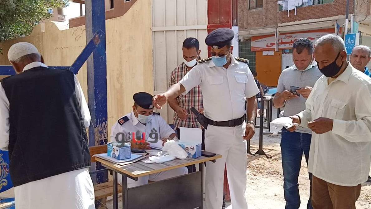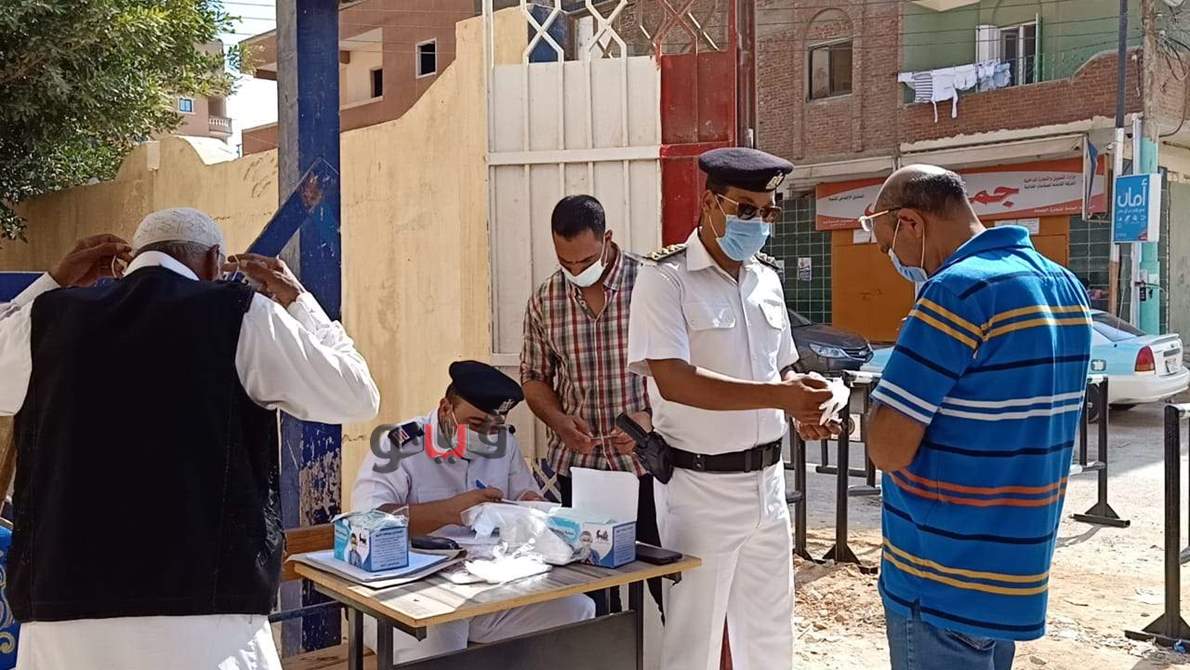 ووزع الشرطة الكمامات والقفازات علي الناخبين قبل دخولهم اللجان الانتخابية للإدلاء بأصواتهم كإجراء احترازي لمكافحة انتشار فيروس كورونا المستجد.